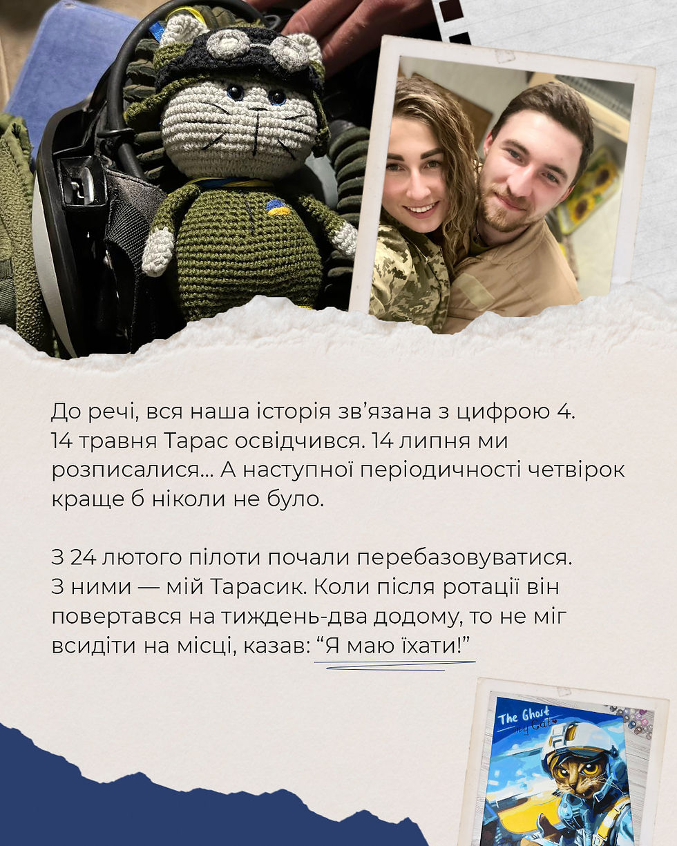 З 24 лютого пілоти почали перебазовуватися. З ними — мій Тарасик. Довго не думаючи, через два дні я сіла за кермо і поїхала до нього. А я, щоби ви розуміли, ніколи толком не їздила. Здолати дорогу мені вдалося завдяки його: “Я в тебе вірю! У тебе все вийде!”. Так, півтори місяці ми були в одному місті. А тоді – ротації, ротації, ротації… Ми не бачили одне одного тижнями, але це не заважало нам спілкуватися щодня. Особливо було страшно, коли загинув наш перший льотчик Женя. Тоді Тарас почав розмову про гроші у випадку чого, а я зупинила його і сказала: “Мовчи! У нас має бути майбутнє! Ця тема – табу!”. А саму просто душив страх за нього!