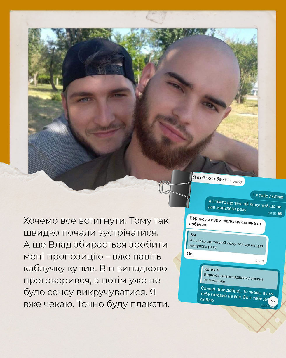 До Влада у мене був не один партнер. Та я помітив, що з ним все дуже інакше. Певно, з війною кохання стало щирішим. У цивільному житті ми не спішили любити, проблеми вирішували дуже повільно. Зараз на це немає часу. Ми просто хочемо бути поруч. Хочемо насолоджуватися один одним.